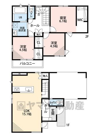 LDK15.7畳(1F)、洋6.1畳(2F)、洋4.5畳(2F) |