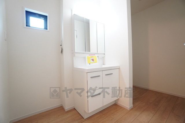 三面鏡裏収納付き洗面化粧台です^^歯磨きセットやスキンケア用品などの収納に便利ですね。