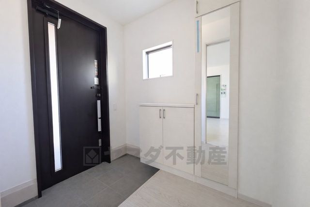 玄関扉にスリットのある明るい玄関です^^ たっぷり収納できるシューズボックス付きなので、家族全員の靴がきれいに整頓できます。