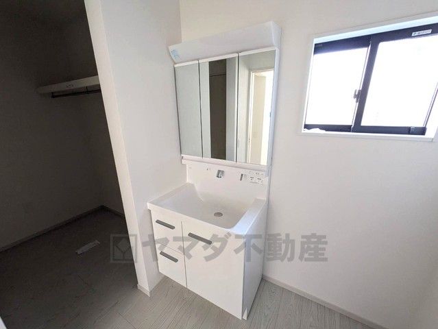 三面鏡裏収納付き洗面化粧台です^^ 歯磨きセットやスキンケア用品などの収納に便利ですね。 洗面室横にはファミリークローク完備で収納充実^^