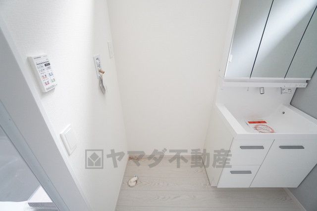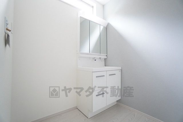 三面鏡裏収納付き洗面化粧台です^^ 歯磨きセットやスキンケア用品などの収納に便利ですね。生活感も隠すことができ、来客時にも安心です。