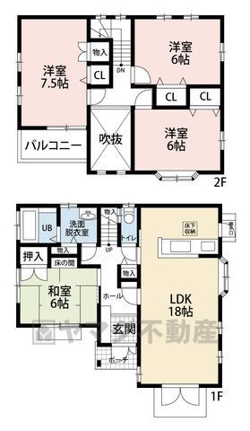 LDK18畳(1F)、和6畳(1F)、洋7.5畳(2F)、洋6畳(2F) |
