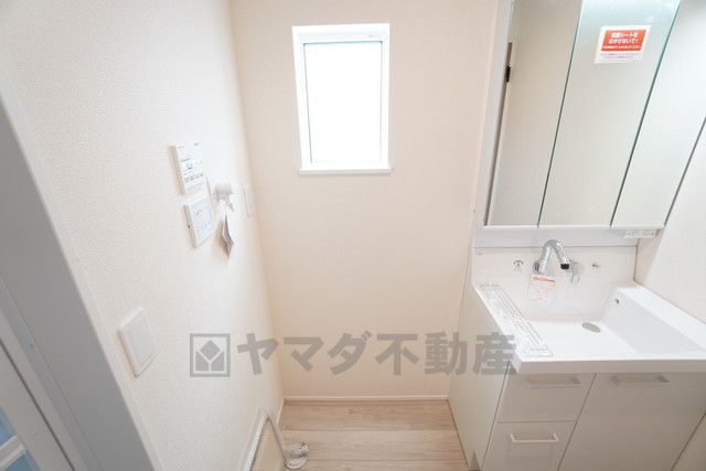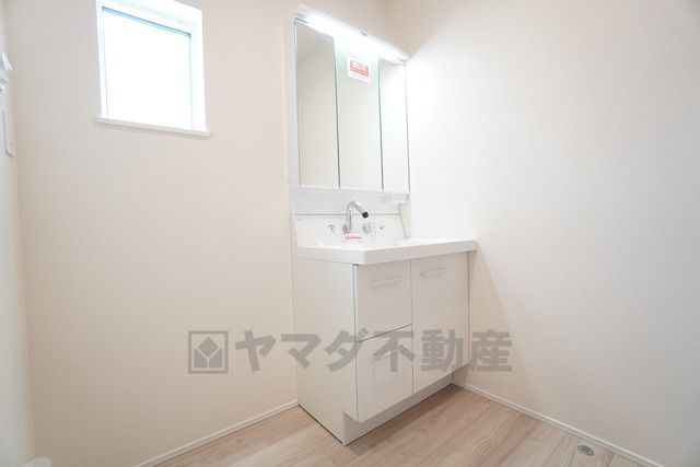 三面鏡裏収納付き洗面化粧台です^^ 歯磨きセットやスキンケア用品などの収納に便利ですね。 生活感も隠すことができ、来客時にも安心です。