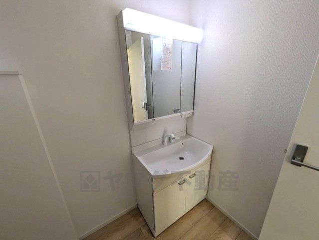 三面鏡裏収納付き洗面化粧台です^^ 歯磨きセットやスキンケア用品などの収納に便利ですね。 生活感も隠すことができ、来客時にも安心です。