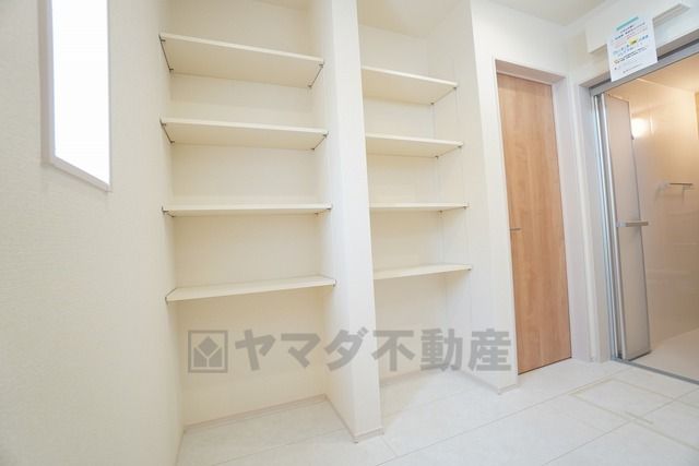 4段のリネンスペース^^衣類やタオルの収納スペースを確保 雑然とした洗面室がすっきり片付けやすくなりますし、パジャマや下着を個室に取りに行くという手間も省けます。
