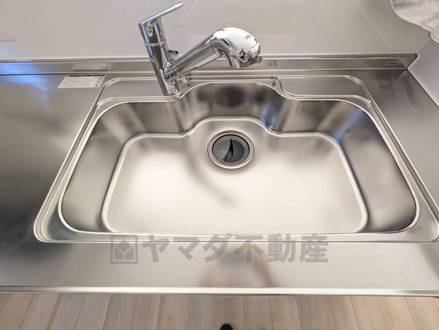 大きなお鍋も楽々洗える幅の広いシンクです^^ステンレスシンクなので簡単にお掃除できますよ。洗剤やスポンジもすっきりできる収納付き。