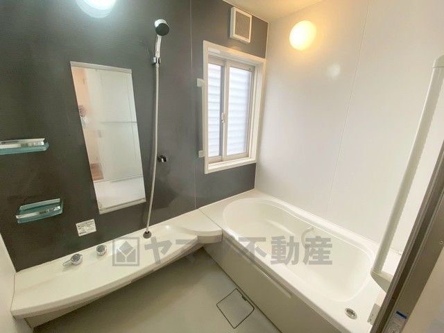 1日の疲れを癒すくつろぎのバスルーム。足を伸ばしてもゆったりと入れるサイズです。お子様と一緒にお風呂に入っても狭くないですね^^