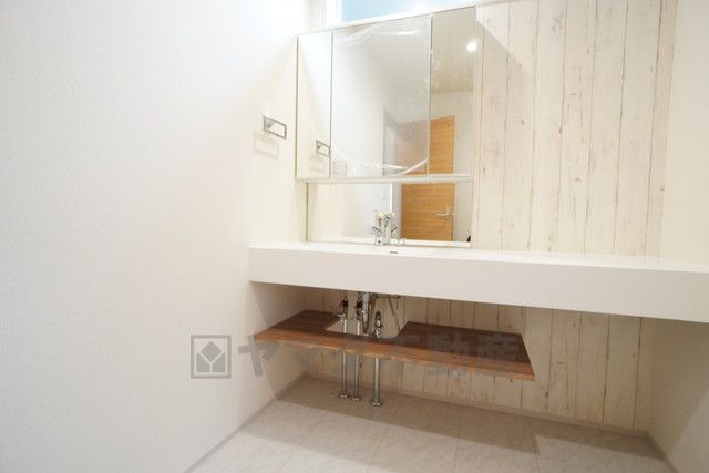 三面鏡裏収納付き洗面化粧台です^^ 歯磨きセットやスキンケア用品などの収納に便利ですね。