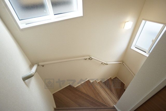 お子様も高齢の方も安心して上り下りができる手摺がついた安心設計です。 階段には小窓を配置しました。日中でも暗くなりがちな階段下が明るくなり安全ですね。