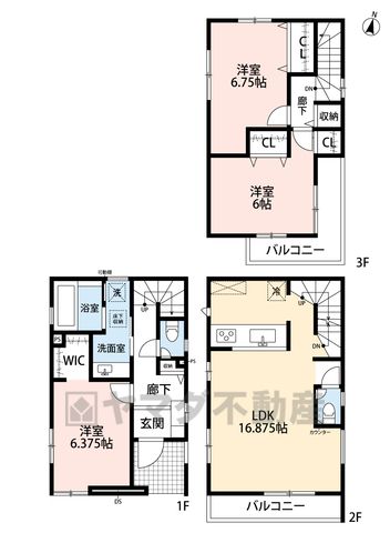 洋6.3畳(1F)、LDK16.8畳(2F)、洋6.7畳(3F)、洋6畳(3F) |
