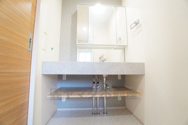 三面鏡裏収納付き洗面化粧台です^^ 歯磨きセットやスキンケア用品などの収納に便利ですね。 生活感も隠すことができ、来客時にも安心です。