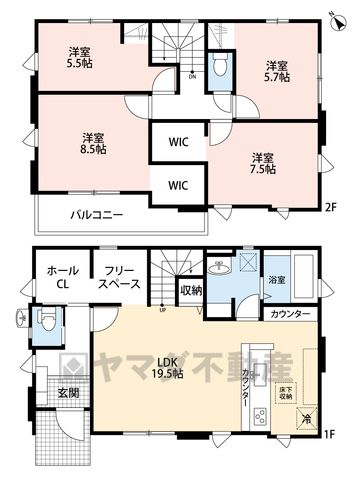 LDK19.5畳(1F)、洋8.5畳(2F)、洋7.5畳(2F)、洋5.7畳(2F)、洋5.5畳(2F) |