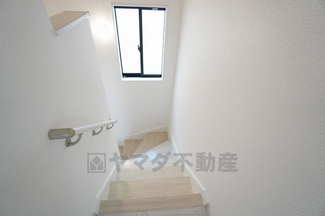 お子様も高齢の方も安心して上り下りができる手摺がついた安心設計です。 階段には小窓を配置しました。日中でも暗くなりがちな階段下が明るくなり安全ですね。