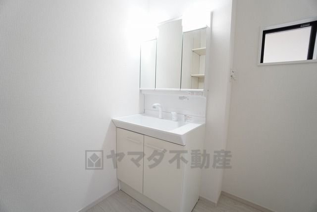 三面鏡裏収納付き洗面化粧台です^^ 歯磨きセットやスキンケア用品などの収納に便利ですね。