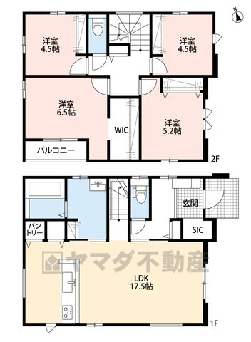 LDK17.5畳(1F)、洋4.5畳(2F)、洋5.2畳(2F)、洋6.5畳(2F) |