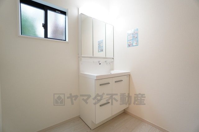 三面鏡裏収納付き洗面化粧台です^^ 歯磨きセットやスキンケア用品などの収納に便利ですね。