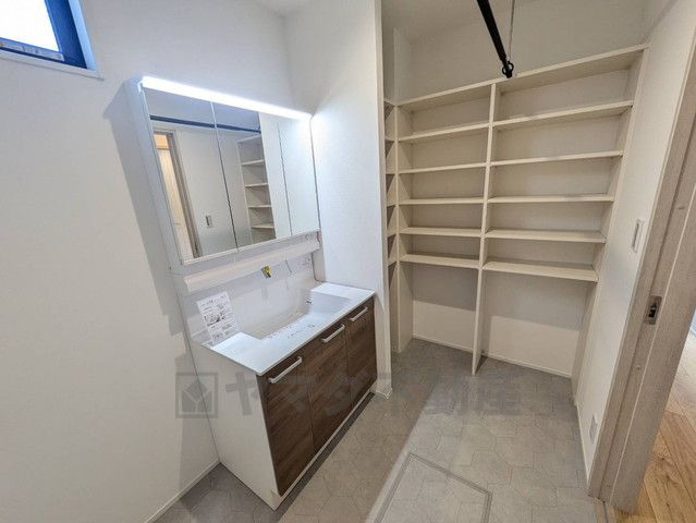 洗面台横に広々とした収納付き。雑然とした洗面室がすっきり片付けやすくなりますし、パジャマや下着を個室に取りに行くという手間も省けます。