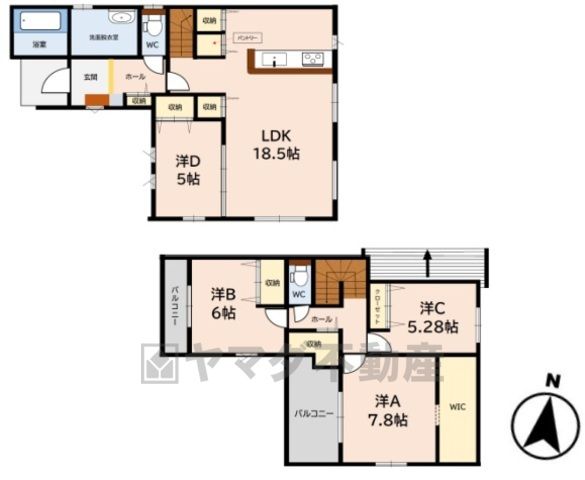 LDK18.5畳(1F)、洋5畳(1F)、洋7.8畳(2F)、洋6畳(2F)、洋5.2畳(2F) |