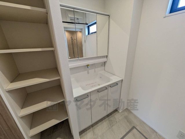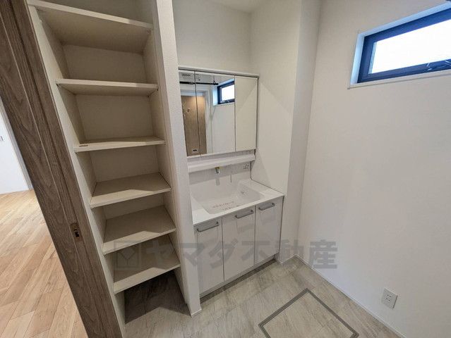洗面台横に収納付き。雑然とした洗面室がすっきり片付けやすくなりますし、パジャマや下着を個室に取りに行くという手間も省けます。