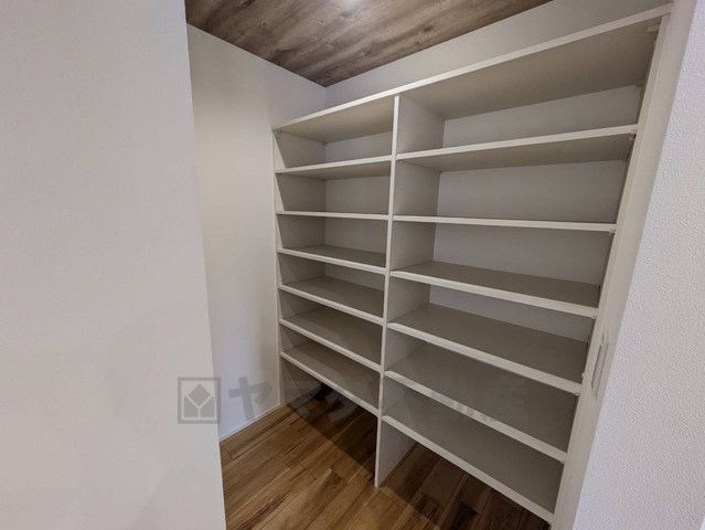 キッチン後方には、高さも幅もしっかりした大容量のパントリーが付いています^^長期保存ができるもの、調理器具、防災グッズを入れておくのもいいですね。