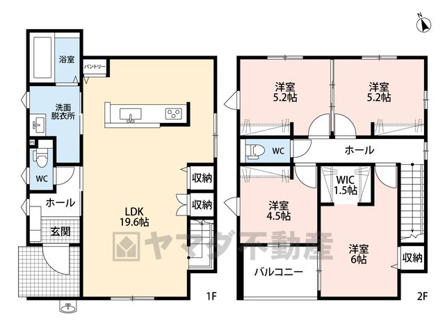 LDK19.6畳(1F)、洋6畳(2F)、洋4.5畳(2F)、洋5.2畳(2F)、洋0畳、洋0畳 |