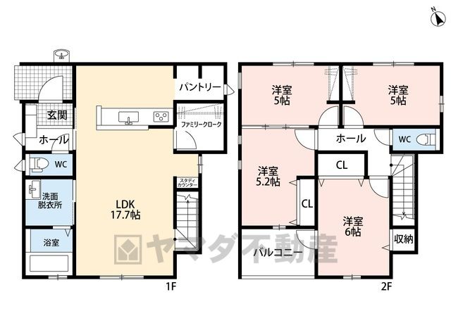 LDK17.7畳(1F)、洋6畳(2F)、洋5.2畳(2F)、洋5畳(2F)、洋0畳、洋0畳 |