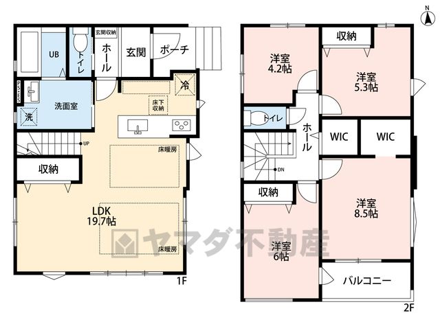 LDK19.7畳(1F)、洋8.5畳(2F)、洋6畳(2F)、洋5.3畳(2F)、洋4.2畳(2F) |