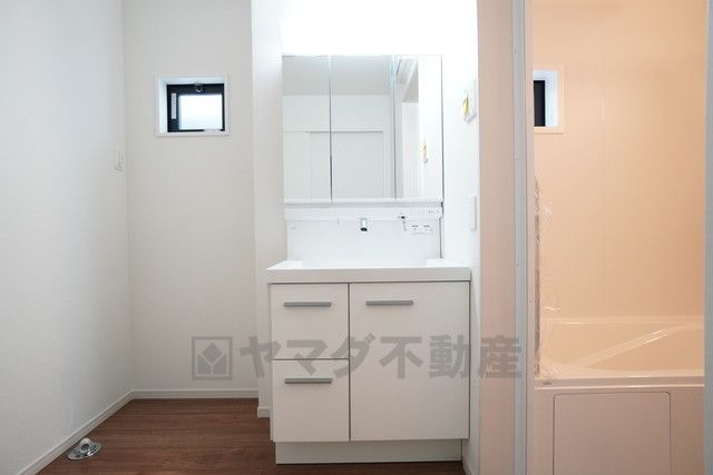 三面鏡裏収納付き洗面化粧台です^^ 歯磨きセットやスキンケア用品などの収納に便利ですね。 生活感も隠すことができ、来客時にも安心です。