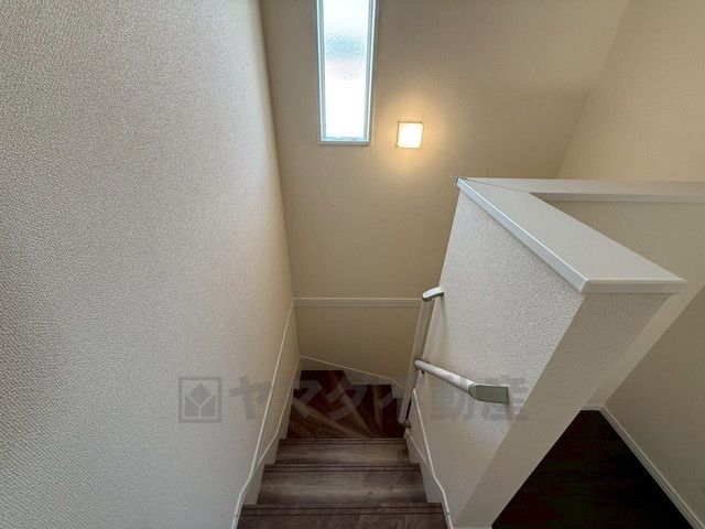 お子様も高齢の方も安心して上り下りができる手摺がついた安心設計です。 階段には小窓を配置しました。日中でも暗くなりがちな階段下が明るくなり安全ですね。