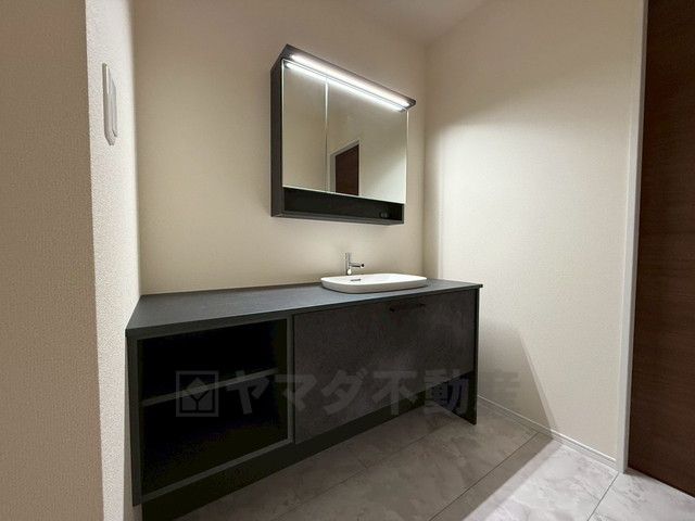 三面鏡裏収納付き洗面化粧台です^^ 歯磨きセットやスキンケア用品などの収納に便利ですね。