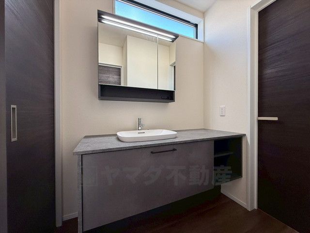 三面鏡裏収納付き洗面化粧台です^^ 歯磨きセットやスキンケア用品などの収納に便利ですね。