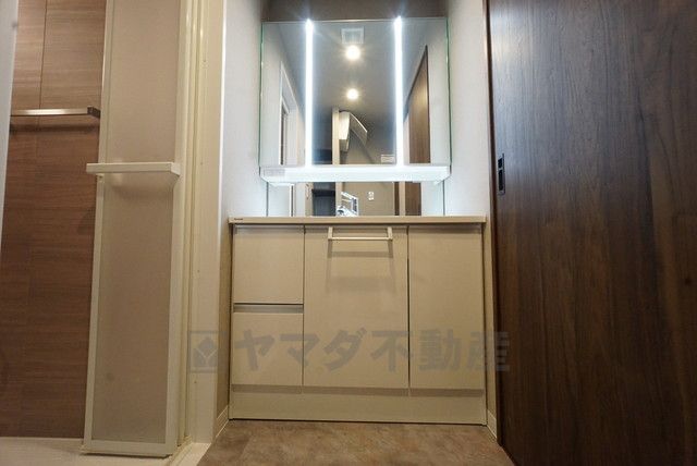 三面鏡裏収納付き洗面化粧台です^^ 歯磨きセットやスキンケア用品などの収納に便利ですね。