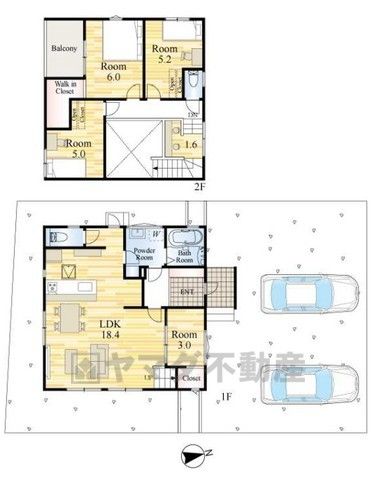 LDK18.4畳(1F)、洋3畳(1F)、洋6畳(2F)、洋5.2畳(2F)、洋5畳(2F)、その他1.6畳 |