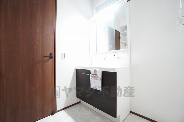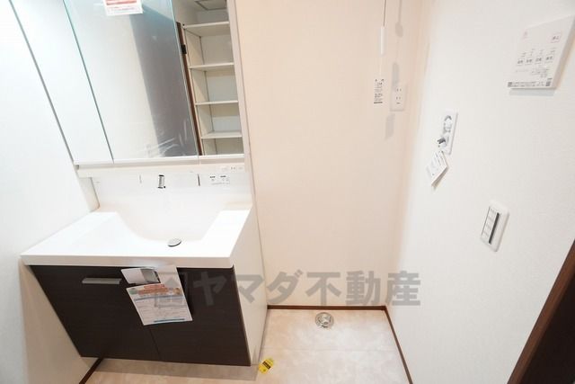 三面鏡裏収納付き洗面化粧台です^^ 歯磨きセットやスキンケア用品などの収納に便利ですね。
