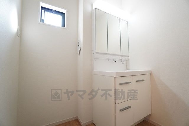 三面鏡裏収納付き洗面化粧台です^^ 歯磨きセットやスキンケア用品などの収納に便利ですね。 ランドリースペース上部には小窓も付いており換気に便利です^^