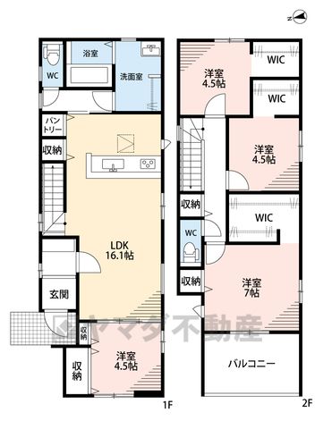 LDK16.1畳(1F)、洋4.5畳(1F)、洋4.5畳(2F)、洋7畳(2F) |