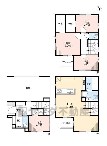 LDK17.2畳(2F)、洋4.1畳(1F)、洋6.2畳(3F)、洋4畳(3F)、洋7.9畳(3F) |