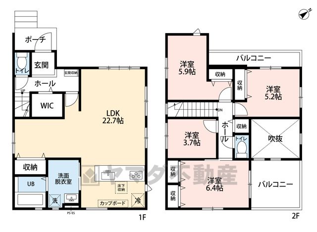 LDK22.7畳(1F)、洋5.2畳(2F)、洋5.9畳(2F)、洋3.7畳(2F)、洋6.4畳(2F) |