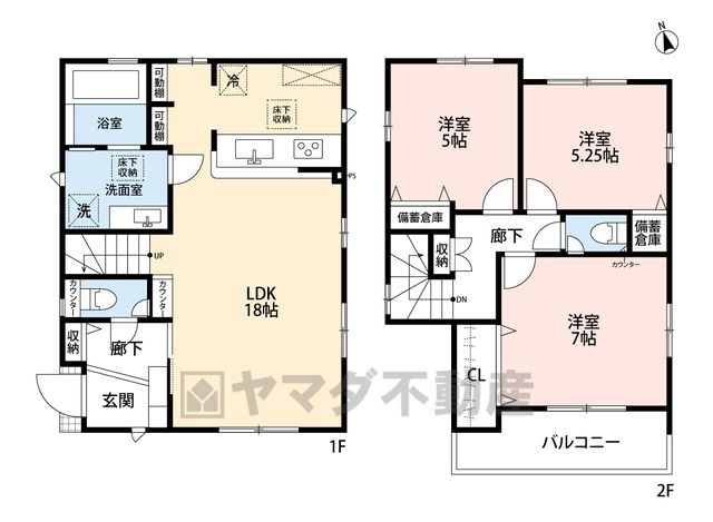 LDK18畳(1F)、洋7畳(2F)、洋5.2畳(2F)、洋5畳(2F) |