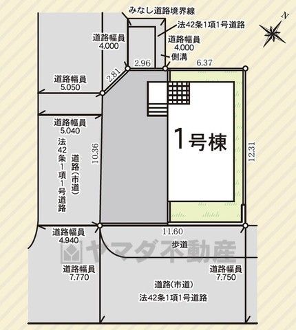 公道 南東 幅員7.7m 公道 南西 幅員5m 公道 北西 幅員4m |