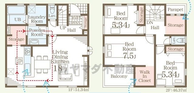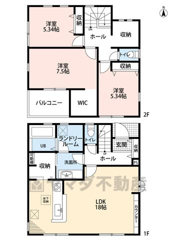 LDK18畳(1F)、洋5.3畳(2F)、洋7.5畳(2F) |