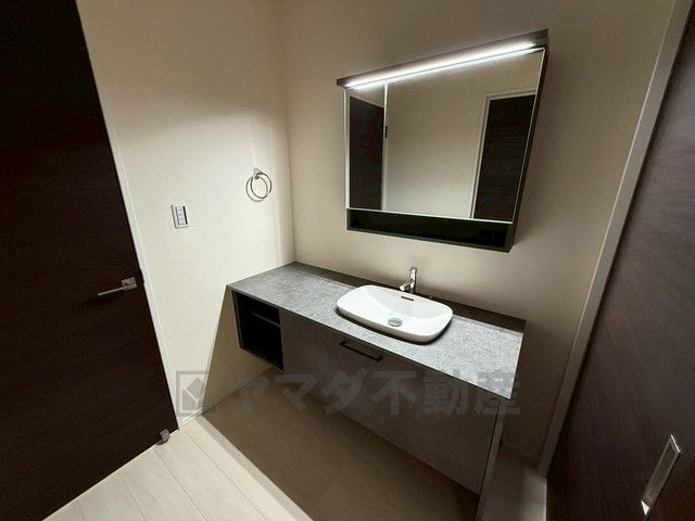 スタイリッシュでお洒落な洗面化粧台^^収納スペースも確保されており歯磨きセットやスキンケア用品などの収納に便利ですね。生活感も隠すことができ、来客時にも安心です。