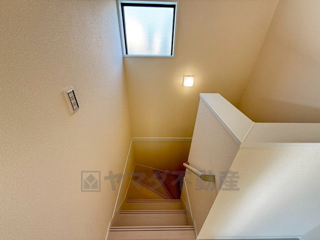 お子様も高齢の方も安心して上り下りができる手摺がついた安心設計です。 階段には小窓を配置しました。日中でも暗くなりがちな階段下が明るくなり安全ですね。