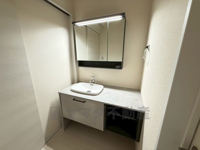 三面鏡裏収納付き洗面化粧台です^^ 歯磨きセットやスキンケア用品などの収納に便利ですね。 生活感も隠すことができ、来客時にも安心です。
