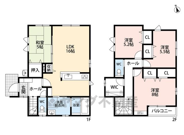 LDK16畳(1F)、和5畳(1F)、洋8畳(2F)、洋5.5畳(2F)、洋5.2畳(2F) |