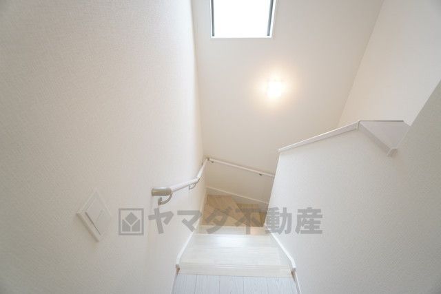 お子様も高齢の方も安心して上り下りができる手摺がついた安心設計です。 階段には小窓を配置しました。日中でも暗くなりがちな階段下が明るくなり安全ですね。