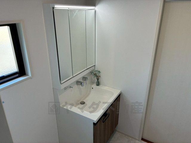 三面鏡裏収納付き洗面化粧台です^^ 歯磨きセットやスキンケア用品などの収納に便利ですね。 生活感も隠すことができ、来客時にも安心です。