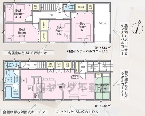 LDK18.1畳(1F)、和3.2畳(1F)、洋4.3畳(2F)、洋4.5畳(2F)、洋5.6畳(2F)、洋6畳(2F) |