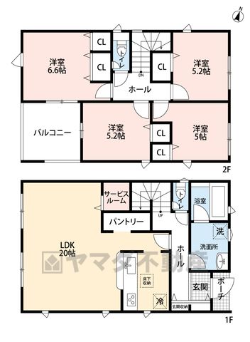 LDK20畳(1F)、洋5畳(1F)、洋5.2畳(2F)、洋6.6畳(2F) |