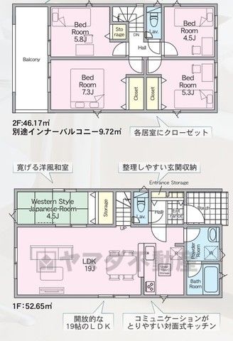 LDK19畳(1F)、和4畳(1F)、洋5.5畳(2F)、洋6.1畳(2F)、洋7.5畳(2F)、その他2.5畳(2F) |